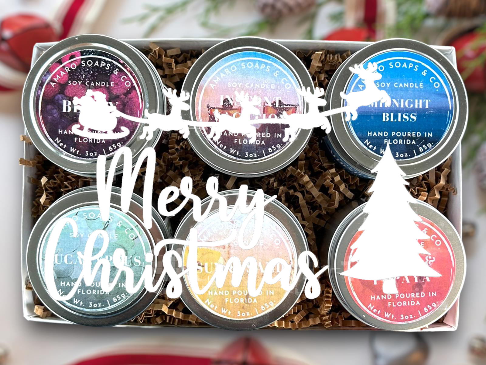 G I F T B O X includes: ✦ 6) 3 oz. hand-poured scented soy candle ✦ Packaged in a beautiful designer box ✦ **Optional** Personalized message printed on a small card P R O D U C T D E T A I L S ✦ All candles are homemade and hand poured with 100% soy wax with no paraffin fillers. We use cotton wicks that are lead and zinc free. Scents are randomly selected from our most popular scents. M E S S A G E ✦ Please refer to the image to see the message designs.