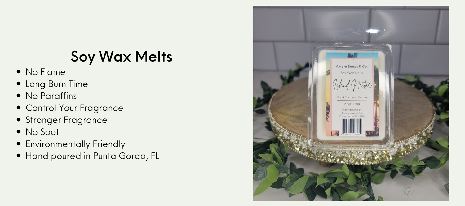 Our wax melts are made with soy wax and are hand-poured. Our wax melts do not contain any added dyes or paraffin. Amaro Soaps & Co. candles and wax melts are hand-poured in Punta Gorda, FL.
