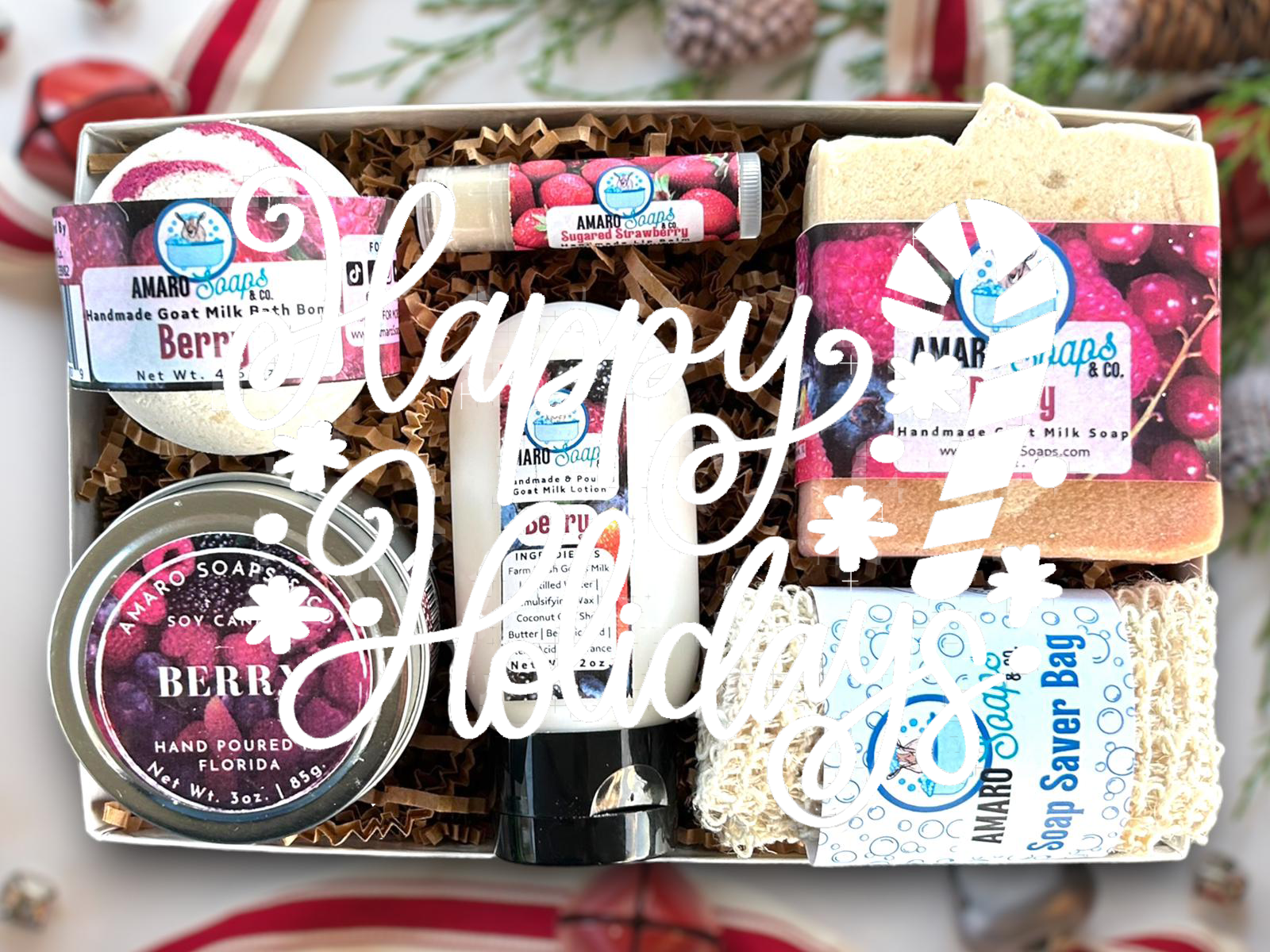 You have multiple scents to choose from and you can personalize this gift with a message that will be applied on the clear top just like the photos above. This box includes 1 Goat Milk Soap Bar 5oz, 1 Goat Milk Lotion 2oz, 1 Goat Milk Bath Bomb, 1 Lip Balm, 1 Soy Wax Candle 3oz, 1 Soap Bag Box dimensions: 8 5/8 x 5 5/8 x 2" Ingredients: Soap bar: Our Farm Fresh Goats Milk, Sodium Hydroxide, Olive Oil, Coconut Oil, Lard, Fragrance, Kaolin Clay, Mica. Lip balm: Beeswax, Shea Butter, Vitamin E Oil, Flavor Soy wax candle: 100% soy wax, wick, fragrance oil Bath Bomb: Goats Milk, Kaolin Clay, Sea Salt, Baking Soda, SLSA, Mica, Olive Oil, Fragrance, Polysorbate 80, Witch Hazel, Citric Acid Lotion: Our Farm Fresh Goats Milk, Distilled water, Emulsifying Wax, Coconut Oil, Shea Butter, Steric Acid, Preservative, Fragrance
